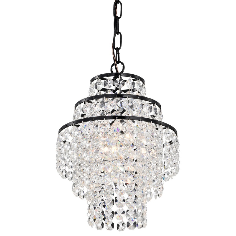 The Arietta 1 light mini chandelier has all the marvelous qualities of a grand crystal chandelier without taking up too much space. A nest of three rings with hanging crystal strands creates a beautiful tiered cascading design. Beneath the multi-faceted clear glass crystals, one E26 base bulb (not included) shines through. Place this light on its own or in multiples above the kitchen island, breakfast nook, or dining room as a source of light and home accent. The antique black finish of this mini chandelier is made to complement a variety of home interiors. Hanging from an adjustable 40 inch chain, this light is also compatible with a dimmer switch and dimmable bulbs.