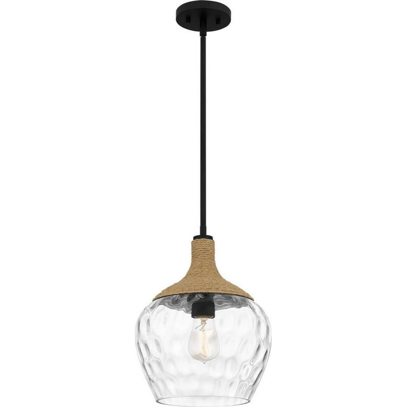 1 Light Mini Pendant In Transitional Style-15.5 Inches Tall and 12 Inches Wide-Matte Black Finish-Clear Water Glass Color . Collection: Allerton Way Material: Steel Finish Color: Matte Black Width: 12″ Height: 15.5″ Length: 12″ Depth: 12″ Lamping Type: Incandescent Number Of Bulbs: 1 Wattage: 100 Watts Dimmable: Yes Desc: Part of the Bailey Street Home Naturals series the Allerton Way one-light pendant exemplifies modern bohemian style. Rope detailing surrounding the top of the glass globe shade calls to mind coastal elements. Choose from either clear water glass or opal etched glass both finished in a handsome matte black. Matte black finish offers a handsome contrast Clear water glass pairs with rope detailing for a coastal feel Durable steel construction is built to last and offers a clean polished look Ideal for a a variety of transitional bohemian coastal or eclectic interiors Can be installed on sloped ceilings.