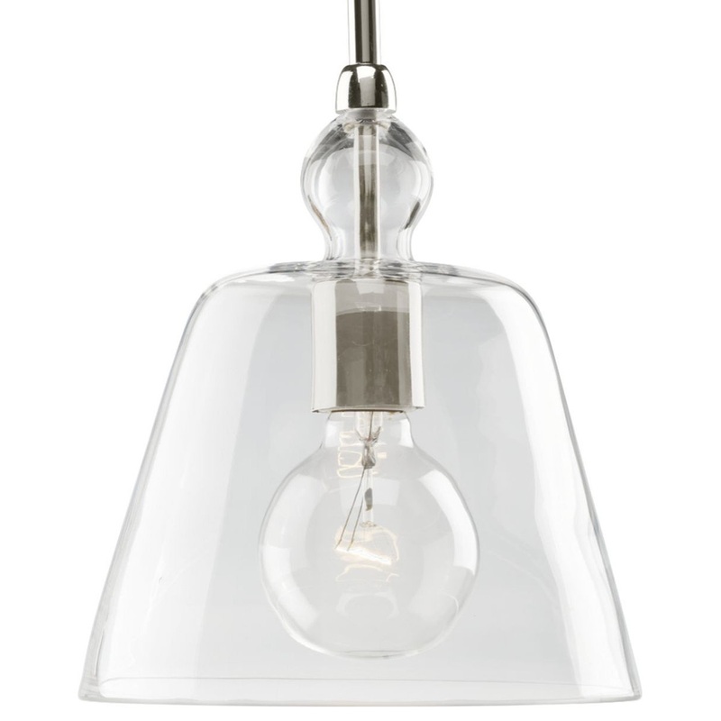-One-light stem hung mini-pendant with hand-blown clear glass and a hint of polished nickel peering through -Finish: Polished Nickel -Bulb Type: Uses Medium Base -Bulb Wattage: 100 -Bulb Quantity: 1 -Listed: Dry location listed -Mount Type: Ceiling Stem -S