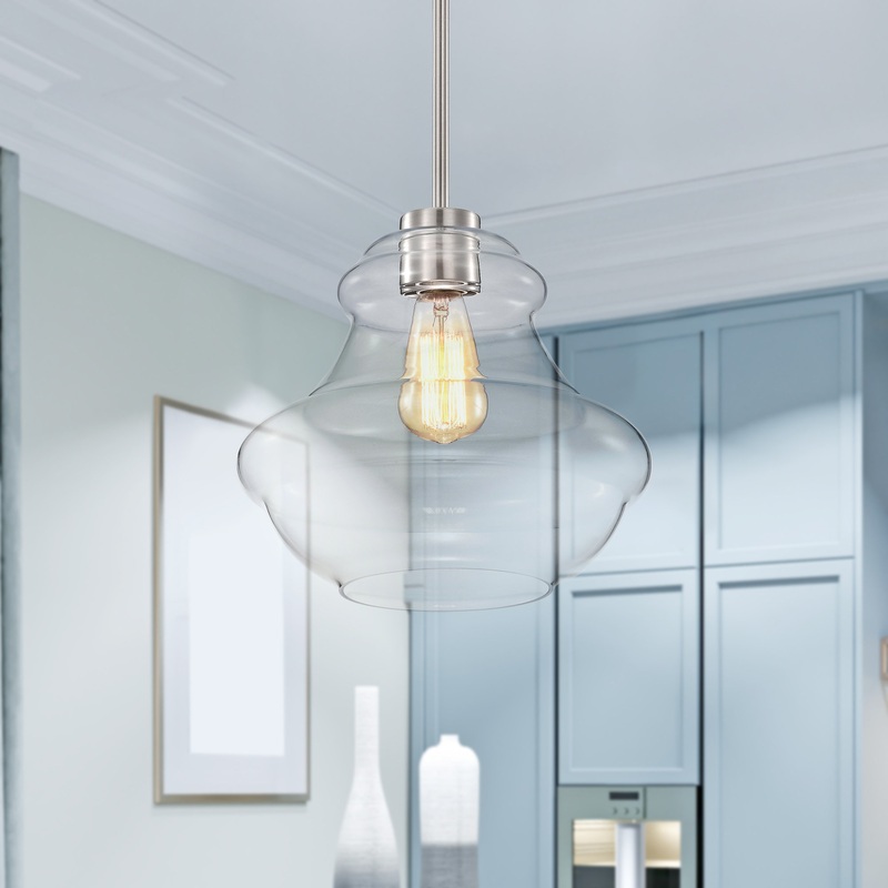 A blend of classic design and modern functionality combine to form this refined 1-light brushed nickel pendant. Adorned with a clear glass schoolhouse shade featuring elegant curves, this pendant exudes timeless charm and sophistication. Suspended from a sturdy rod, the handing height is adjustable, allowing for customizable placement to suit your space perfectly. Whether illuminating a kitchen island, hallway, or dining area, this pendant light casts a warm, inviting glow from the max 100W medium base bulb (not included). We recommend adding a dimmer switch with dimmable bulbs to adjust the mood accordingly.