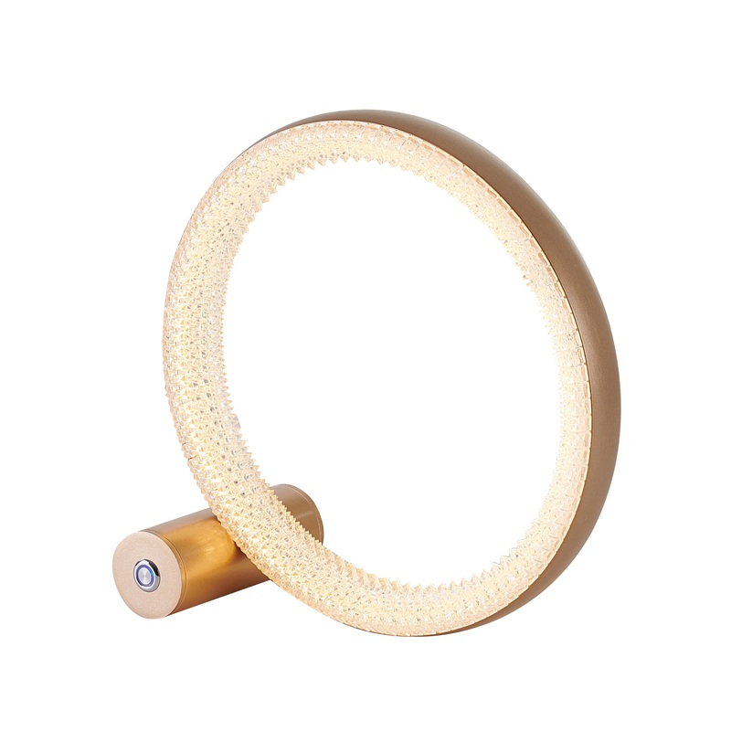 This exquisite LED table lamp is in a gold finish. The frame is made out of iron, and it comes with clear acrylic diffusers. The LED bulb is integrated into the frame. It is great for chair side reading or general room illumination