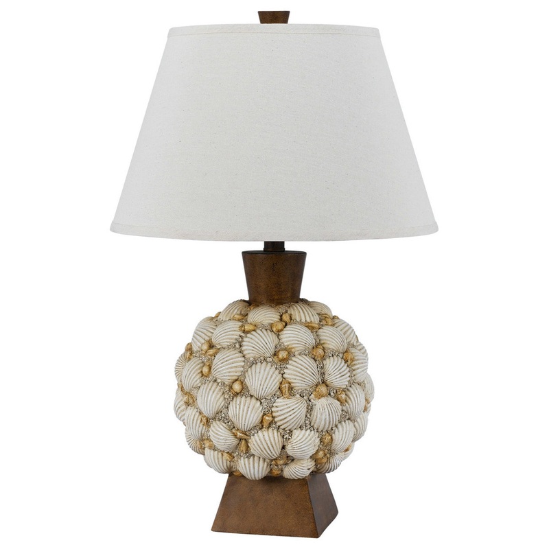 -25 Height Resin Table Lamp in Shell -Durable resin construction -Shade included with lamp -Little to no assembly required -6 foot power cord -Base diameter: 5.25 -Shade top 1: 10 -Shade bottom 1: 15.75 -Shade side: 10 -Shade weight: 4 -Wattage: 150 -Bulb