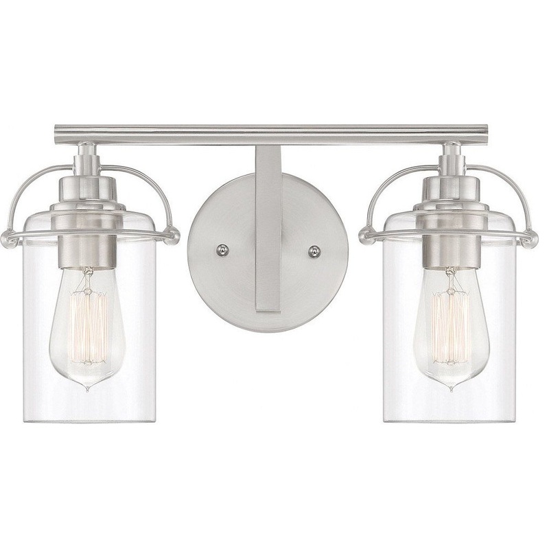 2 Light Bathroom Light Fixture 8.75 Inches high-Brushed Nickel Finish . Gardeners Woods's transitional silhouette charms with unique harness-style brackets and simple clear glass shades. These bath vanity lights are available in multiple sizes and either a