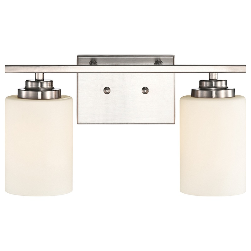 With a clean silhouette, this two light vanity exudes sophistication. Featuring etched white glass shades, a warm hue shines through while providing plenty of illumination. The brushed nickel finish pairs perfectly with the warm glow from the two 60W mediu