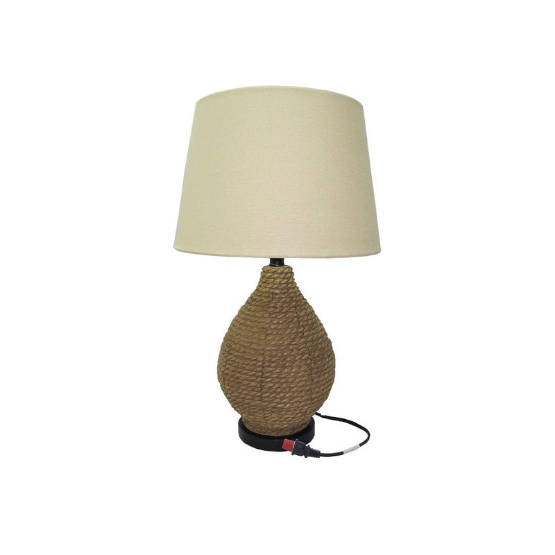 -This jug lamp is composed of jute rope and the ivory shade compliments it perfectly. This lamp requires a 40 watt bulb.