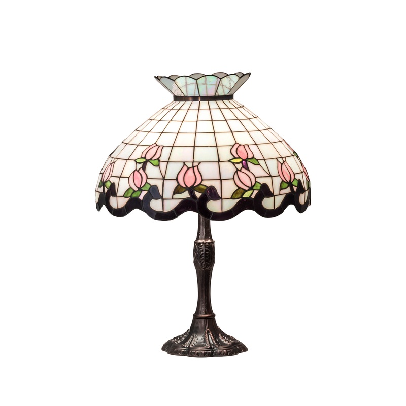 Grace your home with this elegant crowned art glass shade. The shade features a gridwork of White Iridescent glass; adorned with a Mauve Waterglass border of swirling ribbons and perfect Pink rosebuds accented with Green leaves. The stained glass shade is created with the famous Meyda Tiffany copperfoil construction process and complemented with a warm Mahogany Bronze finished base. UL and cUL listed for dry locations. Each shade is a unique work of art with color variations based on natural ingredients inherent in the glass. Contact us if color matching is critical when ordering multiple items.