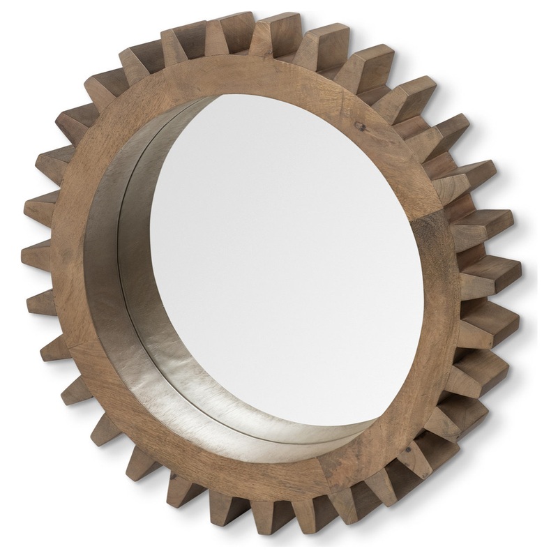 having an industrial design, this mirror will add noticeable variation to your space. whether used alone or paired with other mirrors, this round mirror makes a huge difference in your decor. it is held in a brown cog-like wood frame; add it to any room an