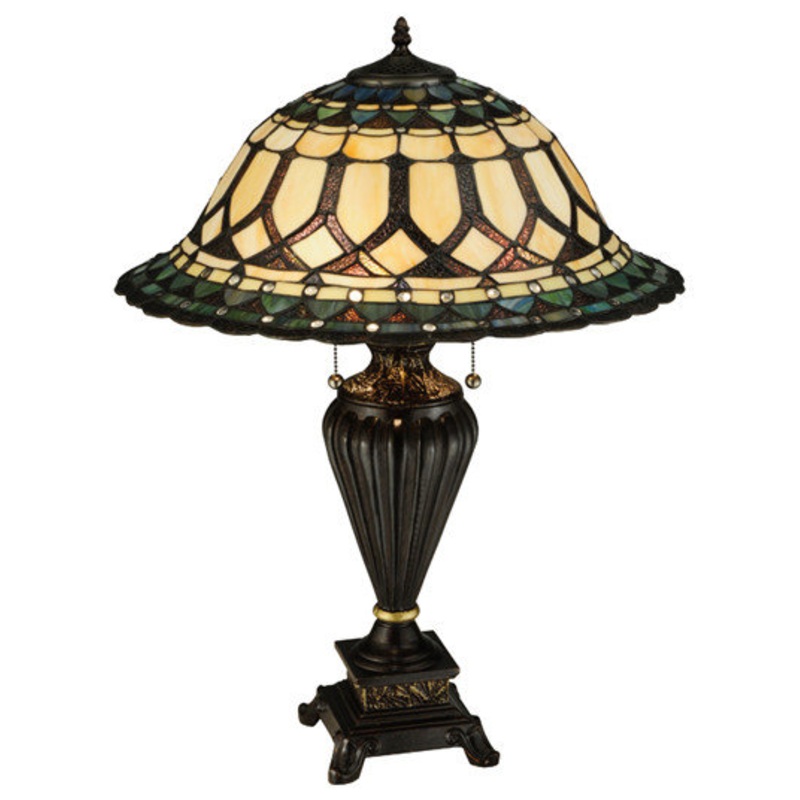 Scalloped art glass designs of Multicolored Purple with Ripple glass and Green trim the top and bottom borders; accented with Clear glass jewels of this resplendent table lamp. Diamond shaped motifs are extended from the top in Beige and Honey colors. The shade was created with authentic stained glass using Meyda Tiffany’s famous copperfoil construction process and is complemented with a base finished in Chestnut with Gold accents.