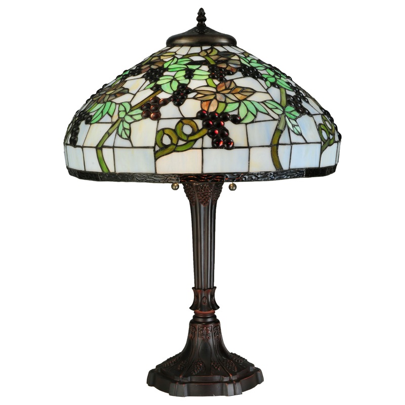 Bring brilliant vineyards into your own room with this lovely lamp. Radiant Concord Purple jewels accented with Multicolored leaves and glistening dew kissed Leafy Green vines wrap around a Cloudy Blue sky background on this stained glass shade. With an exquisite Tiffany-inspired style and a sturdy base hand finished in a handsome Mahogany Bronze finish, this lamp adds an elegant touch to any room.