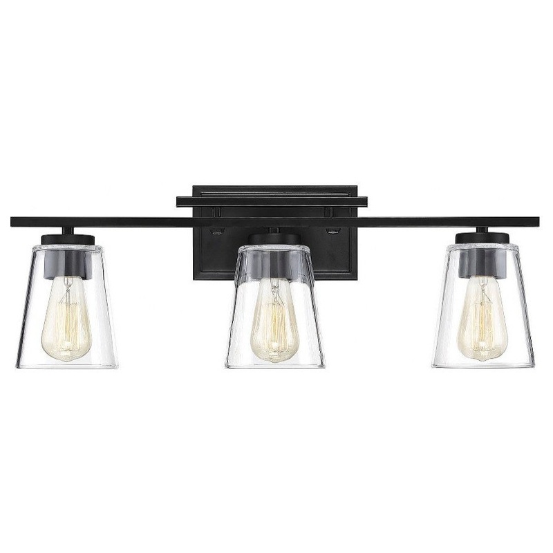 3 Light Bath Bar-Contemporary Style with Modern and Bohemian Inspirations-8.75 inches tall by 24 inches wide-Black Finish . The linear lines of the Palmerston Downs draw the eye to its symmetrical beauty with a Warm Brass finish and clear glass shades. Measuring 24 Inch wide x 8 Inch high x 6-3/8 Inch extension this three-light bath bar provides ample illumination from three 60-watt Edison-base bulbs.
