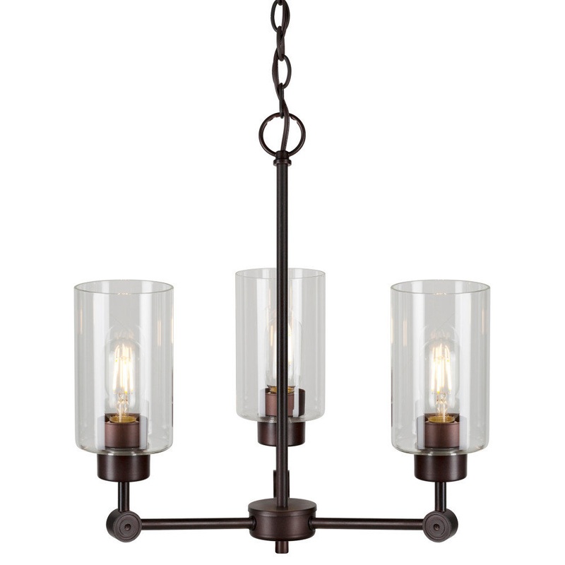 The Jayden chandelier offers a clean transitional design with clear cylindrical glass shades atop a cast round medallion connector. This fixture comes in antique bronze or black finished steel. Arms can be rotated to an up or downward position. Add an Edison style bulb for a more transitional look or an ‘A’ type LED for a more contemporary feel. This 3-light chandelier measures 18 in. L x 18 in. W x 18.25 in. H.. Medium Base Bulb, 75W max per bulb. This fixture is hardwired. Bulbs are not included with the fixture.
