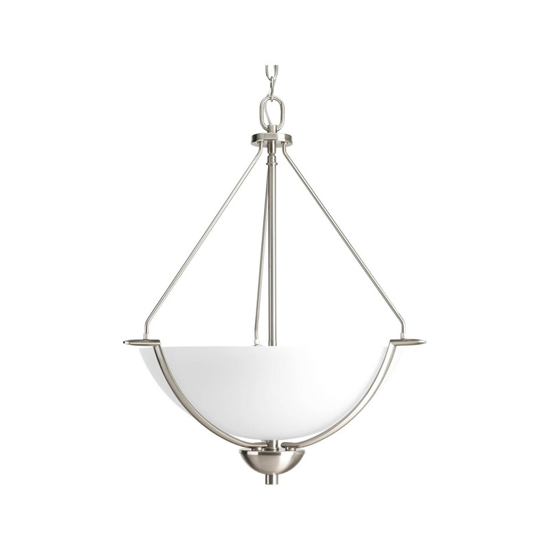 Three-light inverted pendant. A current, truly transitional style is achieved with Bravo's free-flowing arms that are gracefully suspended with fluted shaped glass. -Finish: Brushed Nickel -Bulb Type: Uses Medium Base -Bulb Wattage: 100 -Bulb Quantity: 3 -
