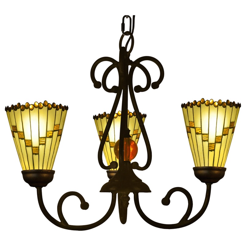 UL Approved/ Dry/ Hardwire/ 3 x 7.5W LED Bulb Included/ Our Jerome 3 Light Pendant features Mediterranean influences that will easily accentuate any decor style. The pendant features a trio of matching uplit art glass shades. Each shade is crafted of golden amber glass wedges set side by side. A band of dark amber squares runs in a wave pattern around the circumference around the center of each shade. The upper edge is set in a zigzag pattern with round amber glass jewels. Jerome is outfitted with our innovative LED module, which will provide you with many years of worry free, energy efficient lighting. The metal chandelier style frame is finished in Tiffany Bronze and features Mediterranean inspired scrollwork surrounding a large amber glass orb at the center. Jerome is hung from a metal ceiling canopy and wire cable/chain, which are finished to match the frame in Tiffany Bronze. A very pretty way to light an informal dining area, our Jerome 3 Light Pendant also works well in a foyer or whole room light.