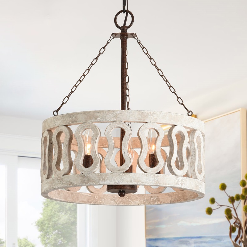 Create a classic mid-century retro style with this perfect chandelier which is a fantastic combination of white distressed logs and metal iron chains. The small delicate cylindrical shade wraps three candle-shaped bulbs make it moderate size and provide ad