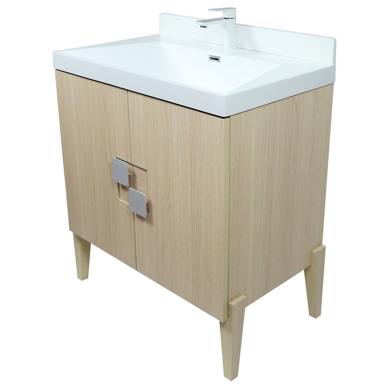 This 31.5-inch single sink transitional vanity has a beautiful, clean design that will rejuvenate any bathroom. It is constructed from high quality Melamine coated engineered wood, finished in a neutral wood color. Melamine is high scratch-resistant proper