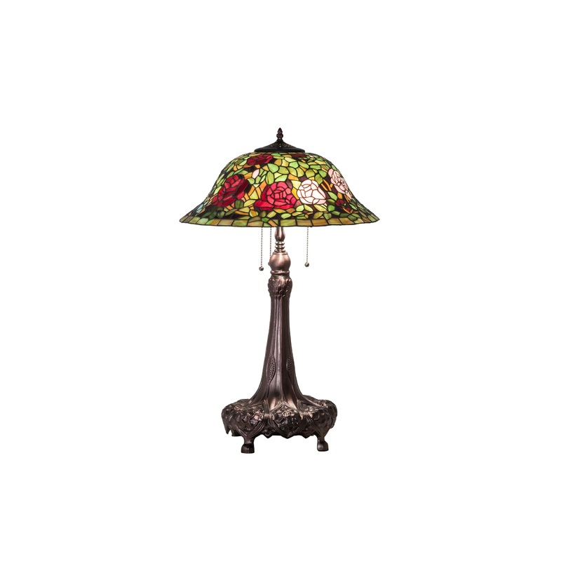 The most beloved of all floral beauties. The Rosebush is beautifully represented in this stunning reproduction of a Tiffany Studio Classic. Petal Pink; Romantic Red and Plum Passion art glass Roses ramble on a maze of Garden Green leaves. The shade is created using the famous Meyda Tiffany copperfoil construction. The delicate domed stained glass shade is paired with a Mahogany Bronze finished lamp base. UL and cUL listed for dry locations.