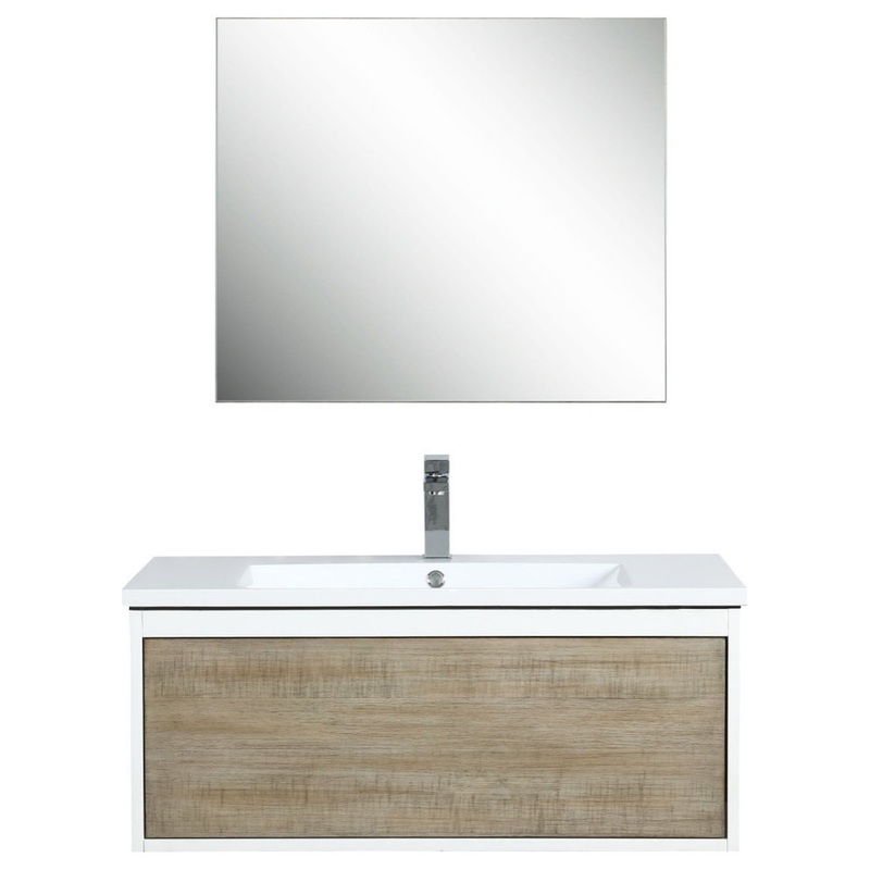 Scopi 36″ Rustic Acacia Bathroom Vanity, Acrylic Composite Top with Integrated Sink, Labaro Brushed Nickel Faucet Set, and 28″ Frameless MirrorInfuse your bathroom with a calming sense of harmony. The Scopi collection blends bold, natural rustic acacia wood grain with stylish vibrant white accents.