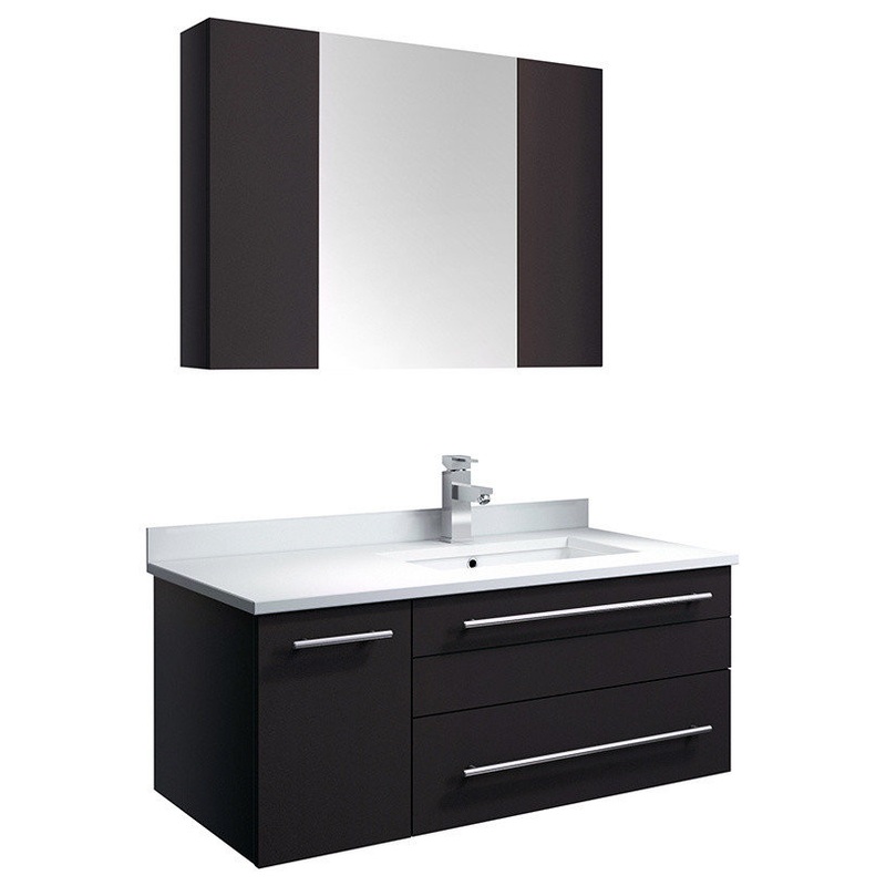 Classically simple with clean lines and a contoured undermount sink, this Fresca Lucera Wall Hung Modern Bathroom Vanity will bring out the best in any bathroom. Measuring 36 in width, this sophisticated vanity has a well constructed solid wood frame with a roomy left-side compartment for holding bathroom essentials and a spacious drawer with a decorative beveled drawer plate design. The door and drawer are soft-closing and feature slim brushed metal handles. This modern vanity has a chic painted Espresso finish. Gracing the top of the vanity is a striking quartz stone countertop with backsplash and a white ceramic undermount sink. The sink is equipped with an integrated overflow and comes with a single hole faucet, p-trap, pop-up drain and installation hardware. A matching Fresca 32 Bathroom Medicine Cabinet in a rich Espresso finish is also included. The medicine cabinet has a mirrored middle section and two side compartments. It features soft-close, hinged doors.