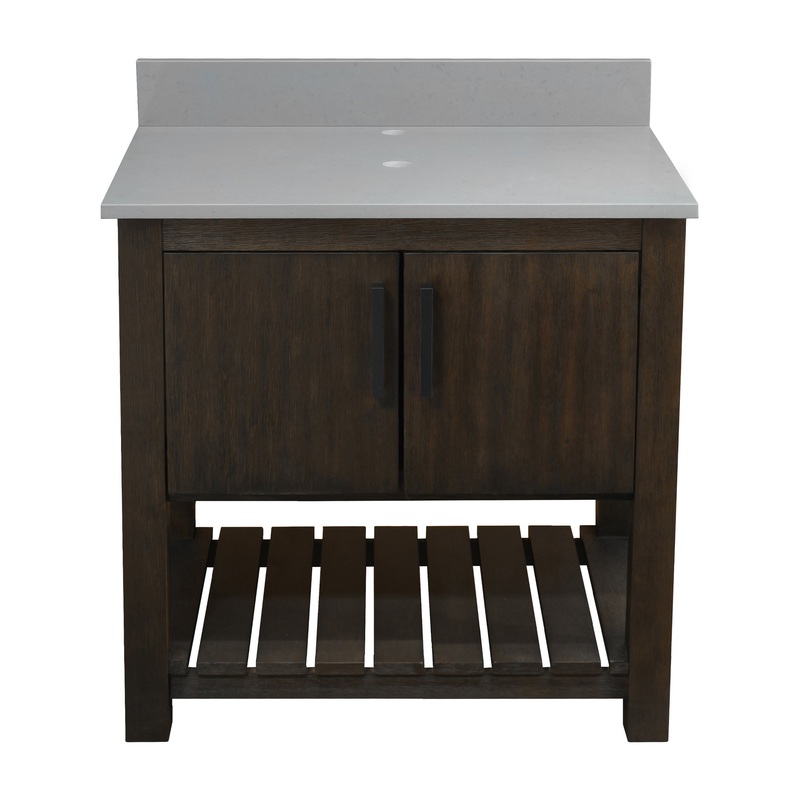 The solid Storm Grey Quartz top matches and fits perfectly with today’s style trends. The counter is already pre-drilled to fit a vessel sink, drain, and faucet of choice. This vanity is already assembled, simply adhere the handles, top, and backsplash to the vanity.