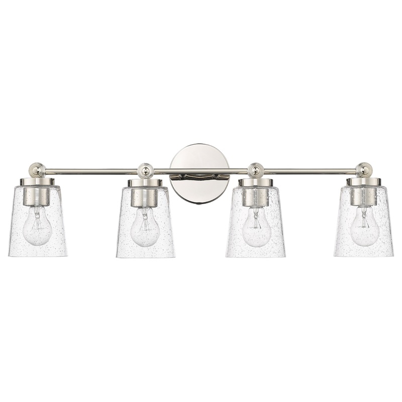 The Lauryn Collection of vanity lighting is the perfect design solution for a modern farmhouse or contemporary space. The fixtures are finished in either matte black or brushed nickel and are available in 3-light and 4-light options. The overall design is reminiscent of barndoor tracks and is completed with classic seeded glass bell-styled shades.