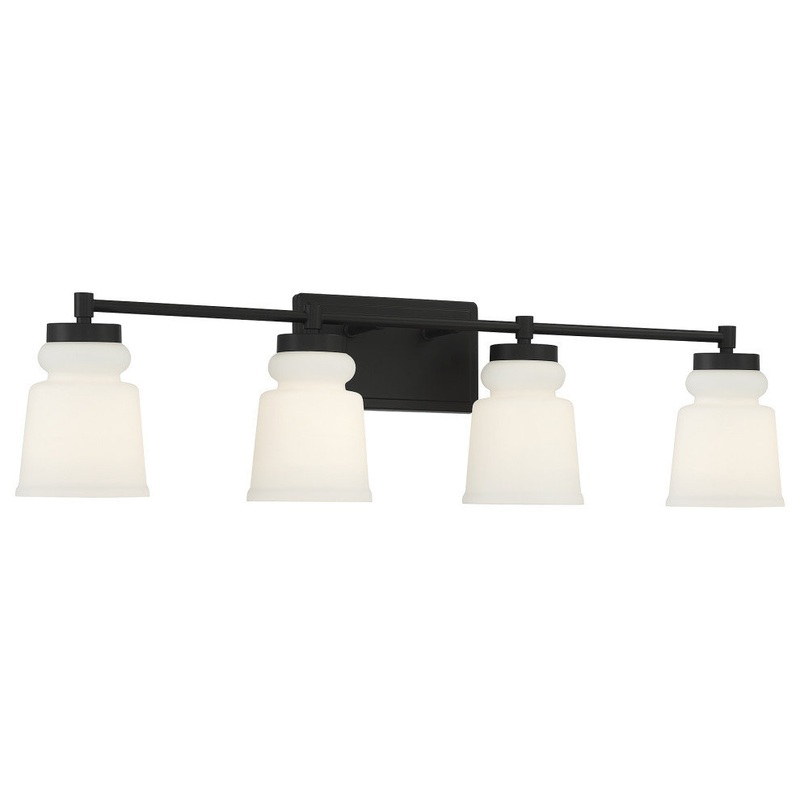 Simply stylish and cleanly classic, this 4-light bath vanity bar showcases vintage-inspired shades of milk glass and a matte black finish for bright yet comfortable illumination. 8.50" height, 32" width, extends 6" from wall. Max 60 watts per bulb, standar