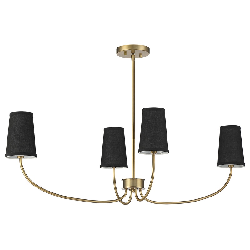 Bring a touch of midcentury modern inspiration to your home with this fashionable 4-light linear chandelier. It features curving arms in a natural brass finish and conical shades of black fabric for a bold two-tone allure. 12" height, 38" length, 19" width
