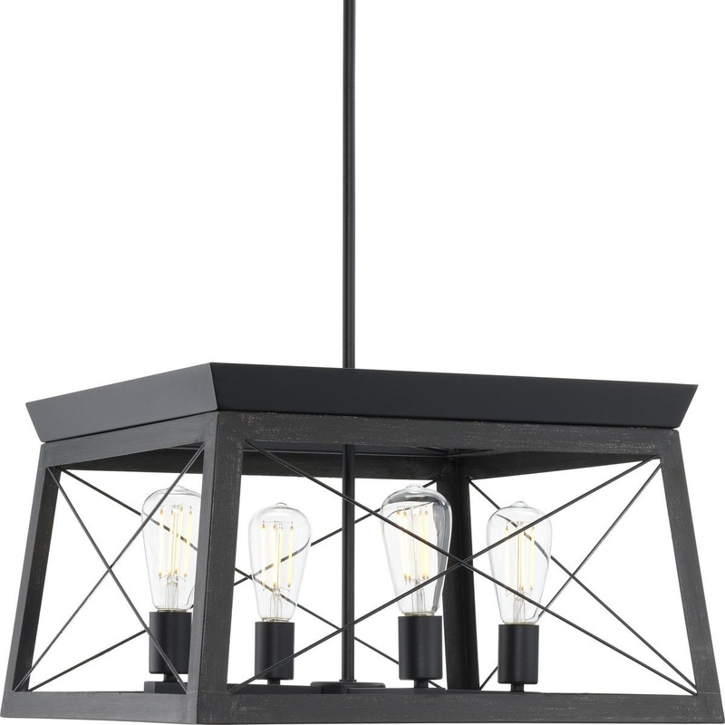 Create a rustic atmosphere with a chandelier from the Briarwood Collection. Light sources exude a comforting country glow through the X-brace design reminiscent of country barn doors and rustic farmhouse gates. The faux wood frame is coated in a cerused black oak finish with textured black accents. Compatible with dimmable bulbs.