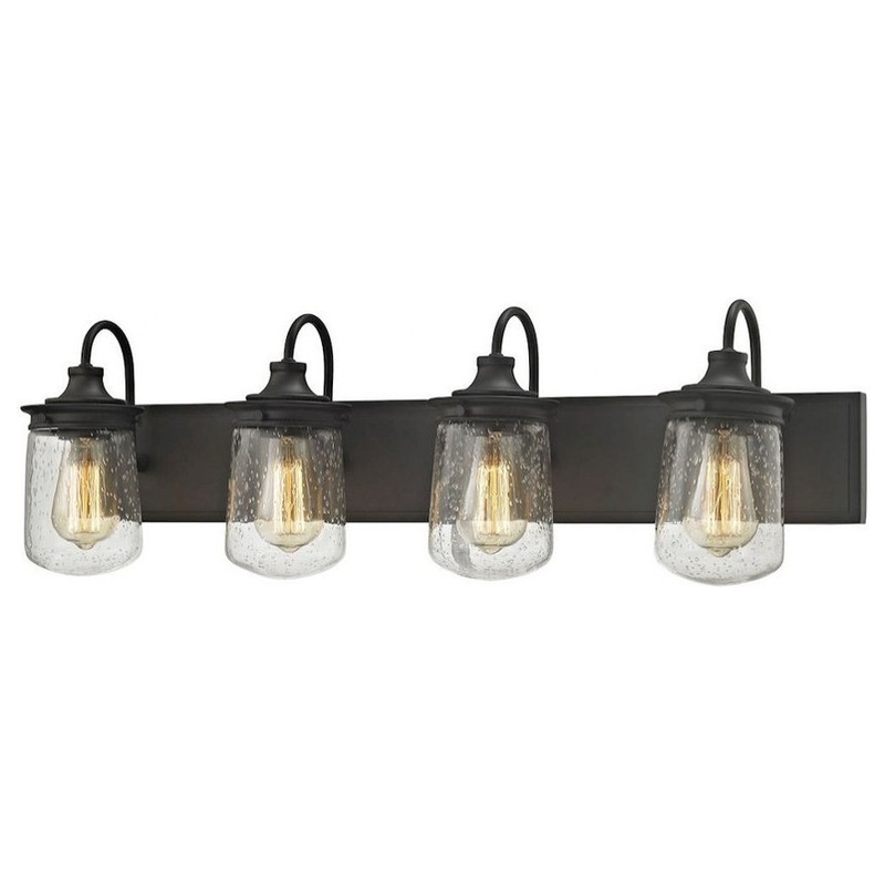 4 Light Steam Punk Bathroom Light with Exposed Bulb Seedy Glass Jars and Rectangular Backplate-Curved Arms . 4-Light Vanity Lamp in Oil Rubbed Bronze with Clear Seedy Glass. The Fox Hill collection gives a nod to the charming Mission designs of the past with a low profile cap and a gently tapered seedy glass shade. Finished in Oil Rubbed Bronze. Features: Product Type: Indoor Lighting Vanity LightMaterial: Glass MetalStyle: TransitionalSub Style: Modern Farmhouse / Country / CottageSafety Rating: ULBulb Included: NoBackplate/Canopy Dimensions (inches): 32×4.5Cord Length (inches): 6