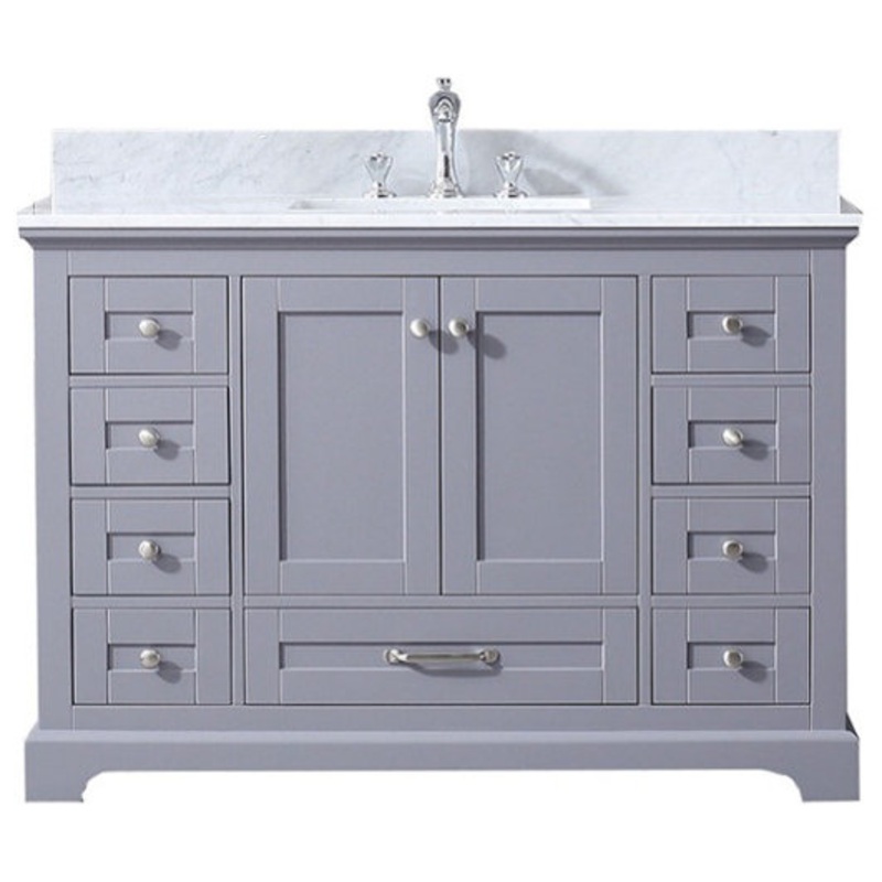 48 inch Dark Grey Single Vanity with White Carrara Marble Top with White Ceramic Square Undermount Sink and no MirrorInspired by classic elements, the Dukes bathroom vanity in dark grey has been upgraded to suit the needs of the modern home. One look at the subtle embellishments in the vanity structure, and the timeless look of the countertop, and you can see the classical inspirations in this piece. But with ample cabinet and drawer space, soft-close hinges and drawer slides, and superior water resistance, this vanitys incredible functionality is purely modern. The vanity also comes complete with an undermount sink, making it easy to give your bathroom that elegant finishing touch youve been searching for.
