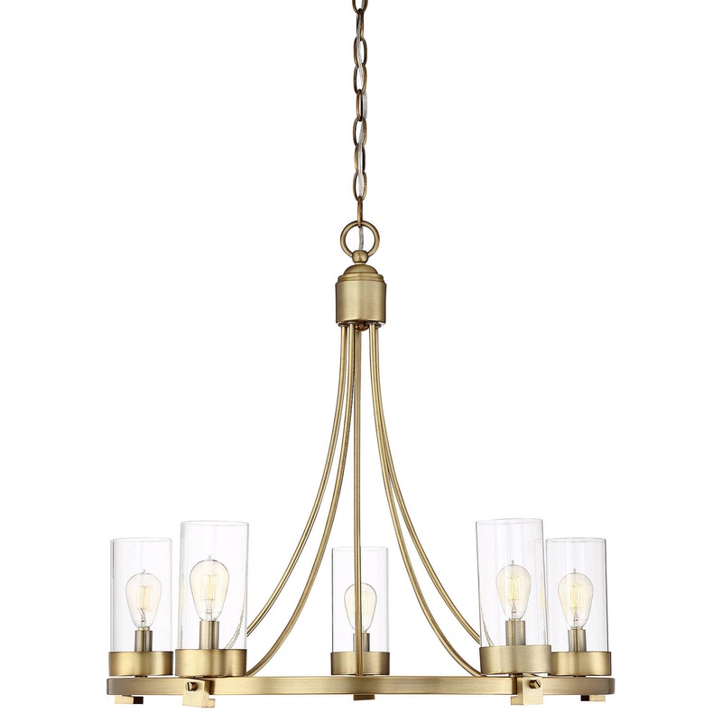 The sleek circular design of this chandelier showcases cylinders of clear glass and a versatile natural brass finish, giving you a look that is perfect for a wide variety of spaces. -Voltage: 120 -Number of bulbs: 5 -Type of bulbs: C -Wattage per bulb: 60