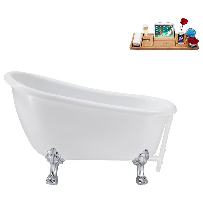 This 53” Streamline N487CH-WH Soaking Clawfoot Tub and Tray with External Drain was specially designed to grant a fresh look in your bathroom and provide you with the ultimate comfort. With a capacity of 60 gallons, the upgraded 53” Streamline N487CH-WH Soaking Clawfoot Tub and Tray with External Drain guarantees a joyful bathing experience – exactly what you deserve after a long day at work. It is made of 100% pure acrylic. The overflow design, in addition to the glossy white external drain and polished chrome clawfeet, adds an artistic touch to the bathtub.