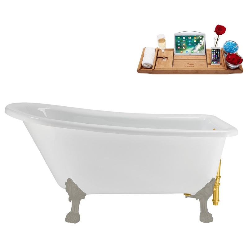 The glossy white 58" Streamline N4860BGM-GLD Soaking Clawfoot Tub and Tray With External Drain in Polished Gold and Brushed Gun Metal Clawfeet will upgrade your bathing experience. Measuring at 58 inches, holding up to 61 gal. of water, and featuring brush