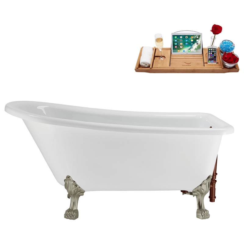 Enhance your bathroom with the sophisticated 58″ Streamline N4860BNK-ORB Soaking Clawfoot Tub and Tray With External Drain in Matte Oil Rubbed Bronze and Brushed Nickel Clawfeet, showcased in a lustrous glossy white finish. Measuring an ample 58 inches and capable of containing 61 gallons, this tub effortlessly marries function and opulence. The distinct brushed nickel clawfeet, coupled with its matte oil rubbed bronze external drain, radiate refined elegance. Made from pure acrylic, it promises enduring brilliance and longevity. Furthermore, its timeless clawfoot design promises a straightforward and prompt installation.