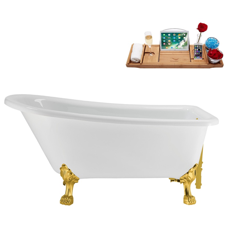 The glossy white 58" Streamline N4860GLD-BGL Soaking Clawfoot Tub and Tray With External Drain in Brushed Gold and Polished Gold Clawfeet will upgrade your bathing experience. Measuring at 58 inches, holding up to 61 gal. of water, and featuring polished g