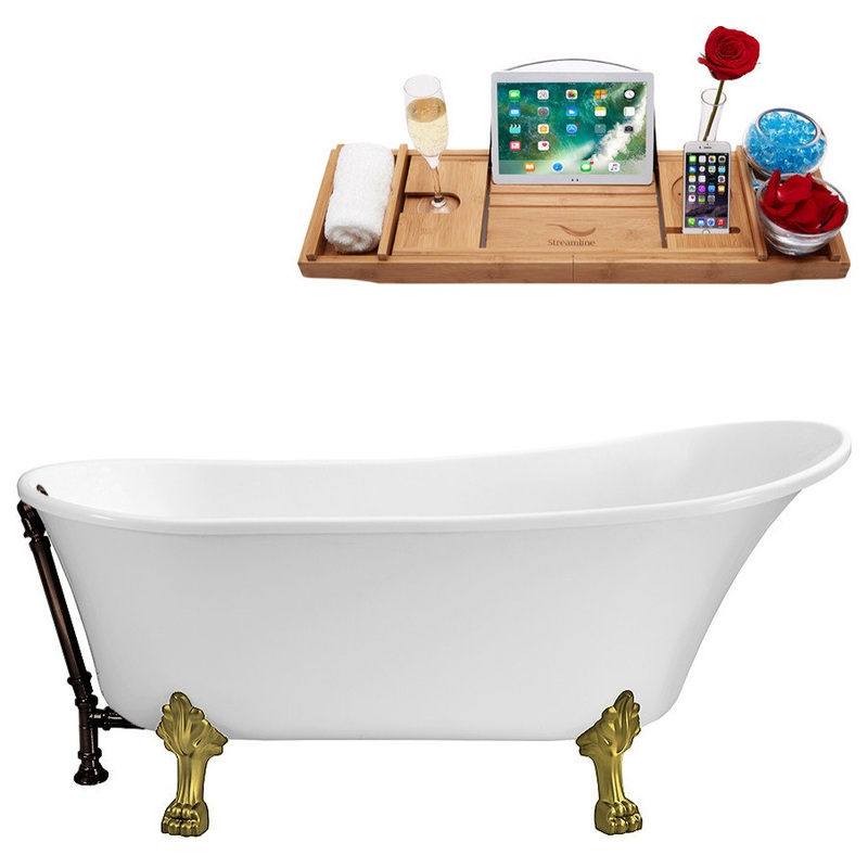 The 59″ Streamline N341BGL-ORB Clawfoot Tub and Tray With External Drain is designed to maximize your comfort while adding a luxurious touch to your bathrooms ambiance. This bathtub measures at 59.1 inches and can hold up to 69 gallons of water just right for a relaxing and soothing bathing experience. For maximum longevity, this bathtub is made from durable acrylic. And on top of everything, it comes with a glossy white exterior and features a matte oil rubbed bronze drain and brushed gold claw feet that add a hint of style and grace to the bathtub.