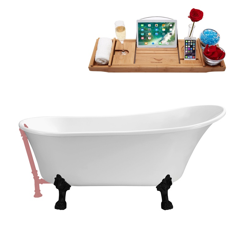 Indulge in the soothing comfort of the 59" Streamline N341BL-PNK Soaking Clawfoot Tub and Tray With External Drain. Designed with a clawfoot style in mind for easy installation and matte black clawfeet and a matte pink external drain for style and practica