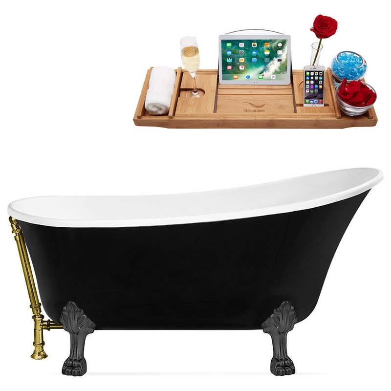 Spoil yourself with this 59″ Streamline N344BGM-BGL Clawfoot Tub and Tray With External Drain. Equipped with brushed gun metal clawfeet and a brushed gold external drain designed to fit 69 gallons of water, this bathtub will bring a personal spa right to your home. The 59″ Streamline N344BGM-BGL Clawfoot Tub and Tray With External Drain comes with a glossy black finish that promises to add a touch of uniqueness to your bathroom area, and is specially crafted from durable acrylic material to withstand any signs of use. And saving the best for last – the clawfoot style of this bathtub makes installation incredibly easy.