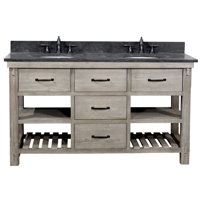 Rustic Style Vanity In A Driftwood Finish. Dark Limestone Top With Under Mounted Ceramic Sink. Pre-Drilled With 3-Holes For 8-Inch Widespread Faucet.