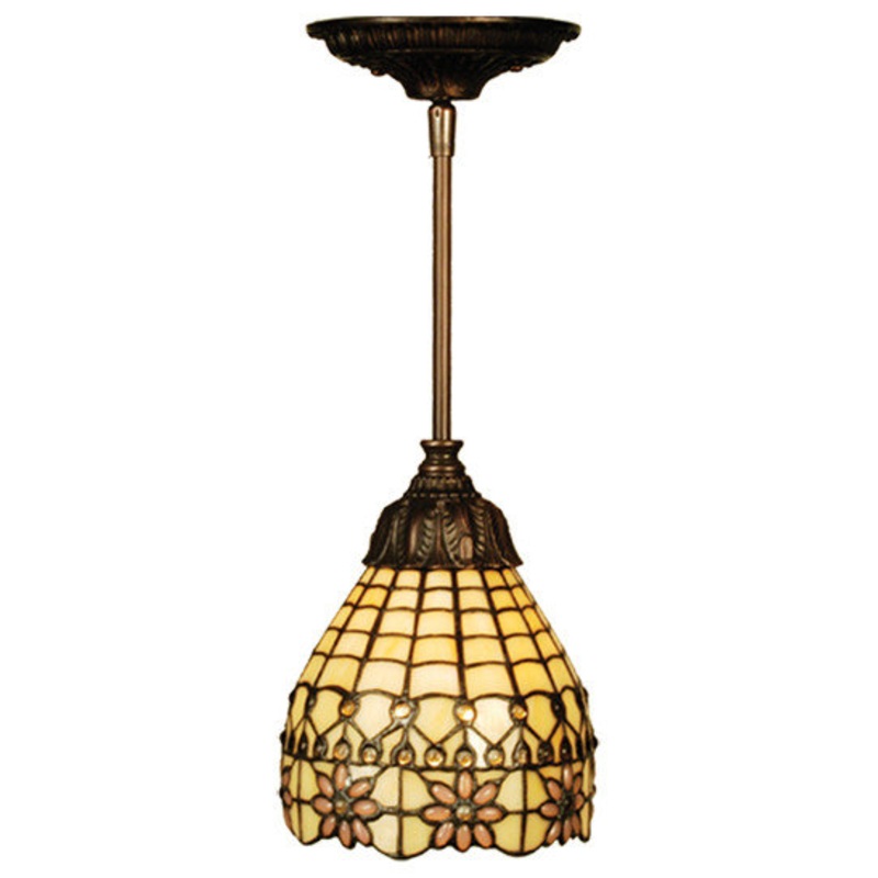 Invite Victorian charm into your home with this intricate Beige stained glass pendant featuring an intricate design accented with delicate Pink flowers. The pendant is hand finished in a handsome Mahogany Bronze.