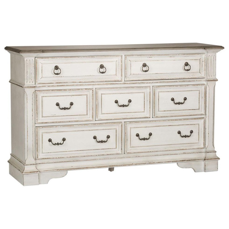 This 7-drawer dresser is the perfect way to accent your room with an effortless blend of European Traditional design. Weathered brown whitewash top and antique white finish, combined with heavy chipping, creates a truly unique look. Storage abounds with 3 different drawer sizes, each equipped with bottom case dust proofing to protect your clothing. The post design with fluted top accents and chamfered edges completes this traditional piece.