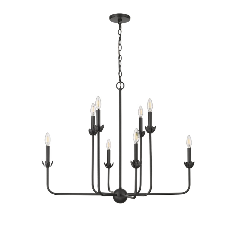Elegant and refined, the Freesia Collection of chandeliers is the definition of a modern take on classic design. The fixtures, finished in matte black, are distinguished by the metal worked, leaf-styled candle cups and are available as 6-light and 8-light