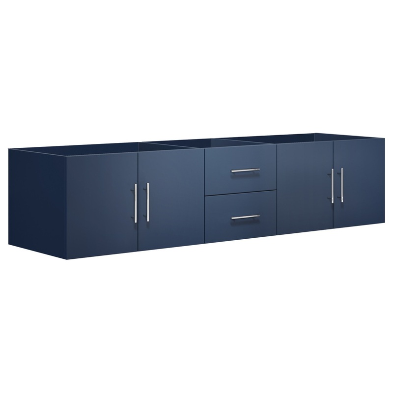 Geneva 80″ Navy Blue Vanity Cabinet OnlyThe wall-mounted Geneva vanity in navy blue from Lexora is a beautiful blending of postmodern style and sensible functionality. Its simple, box-like design lends hints of classical style. When mounted on the wall, the Geneva vanity leaves ample space beneath for additional storageideal for bathrooms with limited space. This piece is all you need to give your bathroom a total makeover.