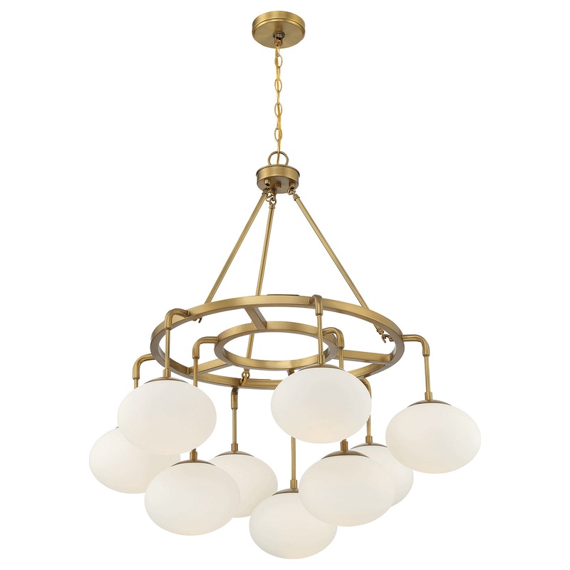Bursting with sleek industrial inspiration, this 9-light chandelier showcases bubbly shades of white milk glass hanging at different levels for elevated style. Finished in natural brass. 38″ height and 34″ width. Max 60 watts per bulb, standard size A19 bulbs recommended. LED compatible. Canopy 5.13″ width and 1″ height. Supplied with 120″ of chain.
