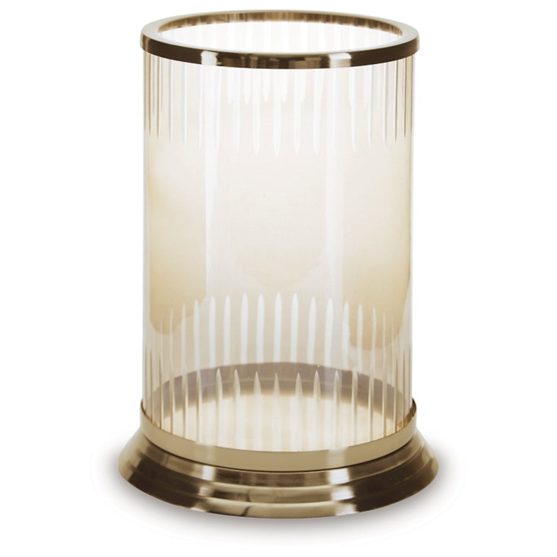 Illuminate your home in traditional style. A brass-tone finish on this candle holder brings a classic feel to the metal base. Its carved glass, in a light amber hue, gives you a timeless aesthetic you can love.Made with metal and light amber carved glassBr