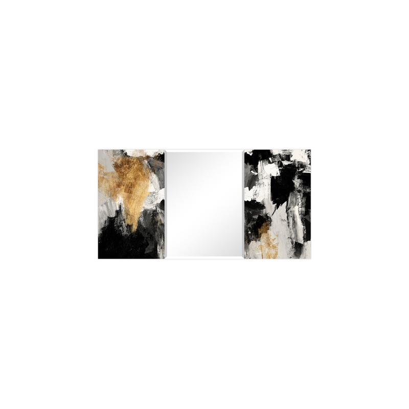 Empire Art Directs collection of printed, frame-less, free floating, tempered glass was inspired by the French technique of Verre Eglomise in which artist’s literally painted the back of clear glass so that when viewed from the front the painting is brought to life under the depth of the glass. This piece of a gold and grey abstract takes that same tempered glass and displays a beveled mirror in front of it. 4 strong steel hangers are attached to the back of the mirror for quick and easy installation either vertically or horizontally.