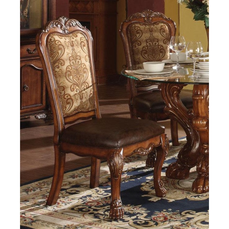 Set of 2 Dresden Collection Traditional style Solid woods and veneers Brown Cherry Oak finish Curved front legs Fabric upholstery on the backrest Faux leather seat High back Intricate wood carvings Sturdy and durable construction