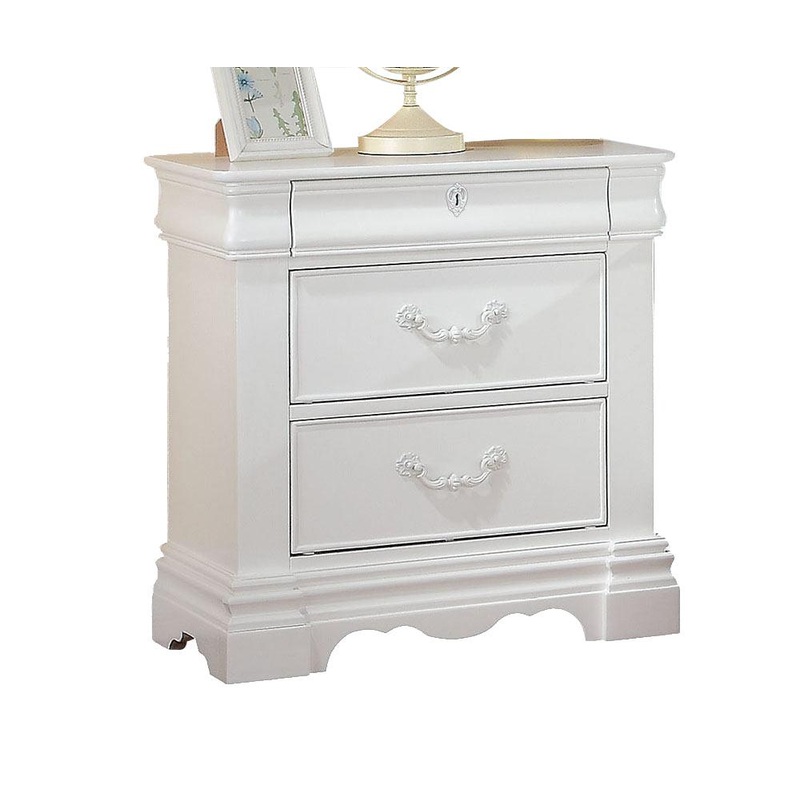 White finish Full extension drawer glides Classic design Sturdy construction Decorative carving style Decorative handle accents Kenlin glides French dovetailed at front drawer & English dovetailed at back drawer Felt lined top drawer 2 Drawers 1 Top drawer