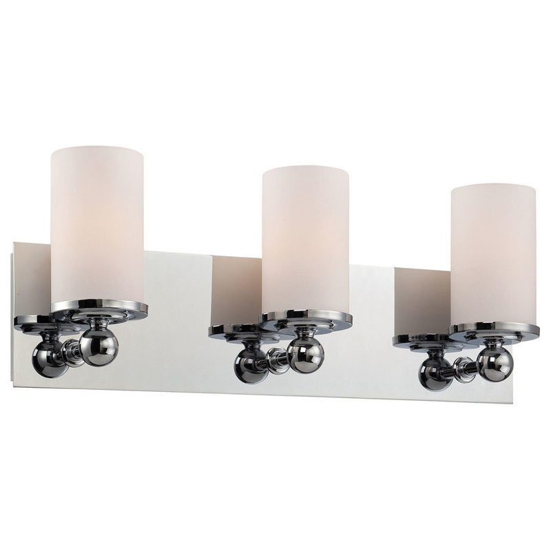 A traditional contemporary vanity family. Polished chrome ball details holding up white opal glass cups. Available in single, double, triple, or quad lamp options. Indoor use only.
