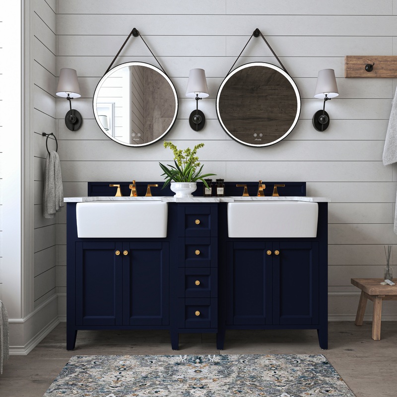 You just can’t take your eyes off our Adeline Collection. It conveys understated elegance that resonates the rich history of the farmhouse sink period. The large farmhouse sink is not only aesthetically pleasing, but also functional for your everyday use. In crafting the Adeline collection, no detail was overlooked – from selecting quality wood to using the most durable soft-close hardware. The vanity set includes: a furniture style cabinet, 2 farmhouse basins, an imported Italian Carrara white marble top, a 4″ solid wood backsplash, solid wood dovetailed drawer boxes, slow closing doors/drawers, and satin brushed gold hardware. Being meticulously crafted, the Adeline Collection will be cherished by your family for generations to come.
