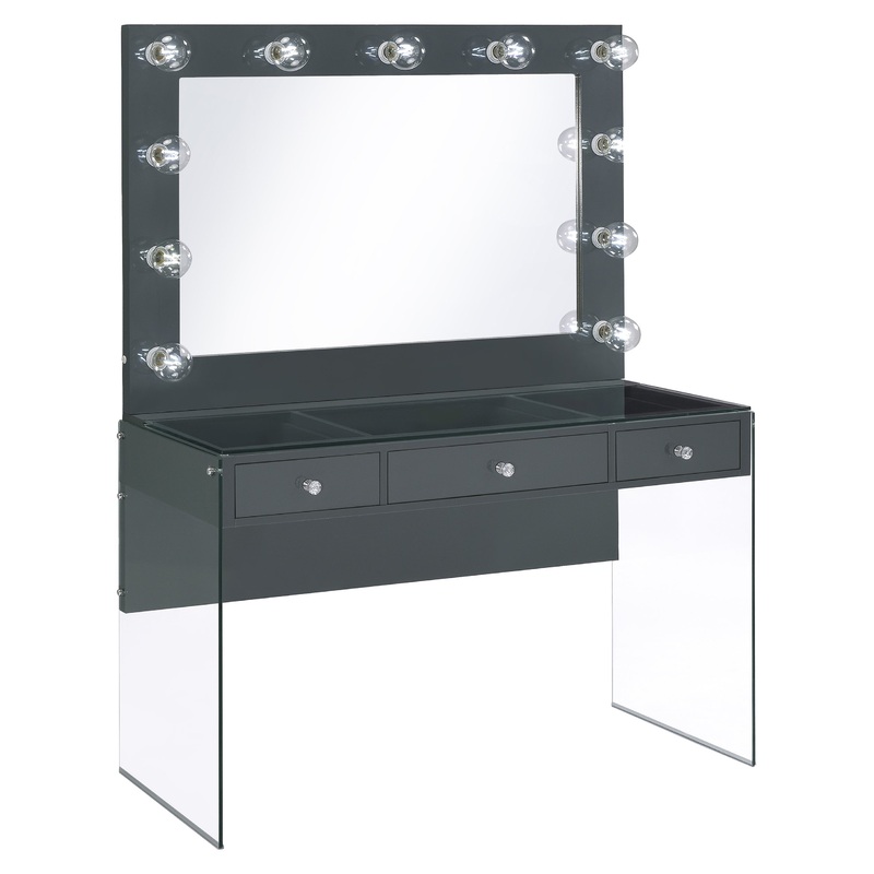 Add a bold, dramatic touch with this modern vanity set. Complete with a smooth, grey high gloss lacquer finish across the tabletop and mirror frame, this vanity matches a variety of color palettes. Supported by clear tempered glass side panels, the vanity appears to float in midair, leaving an open and airy flair. Continuing the glass feature is a clear tempered glass top that showcases accessories and cosmetics inside the three drawers. The oversized mirror also offers ample lighting with eleven retro-like globe shaped bulbs.